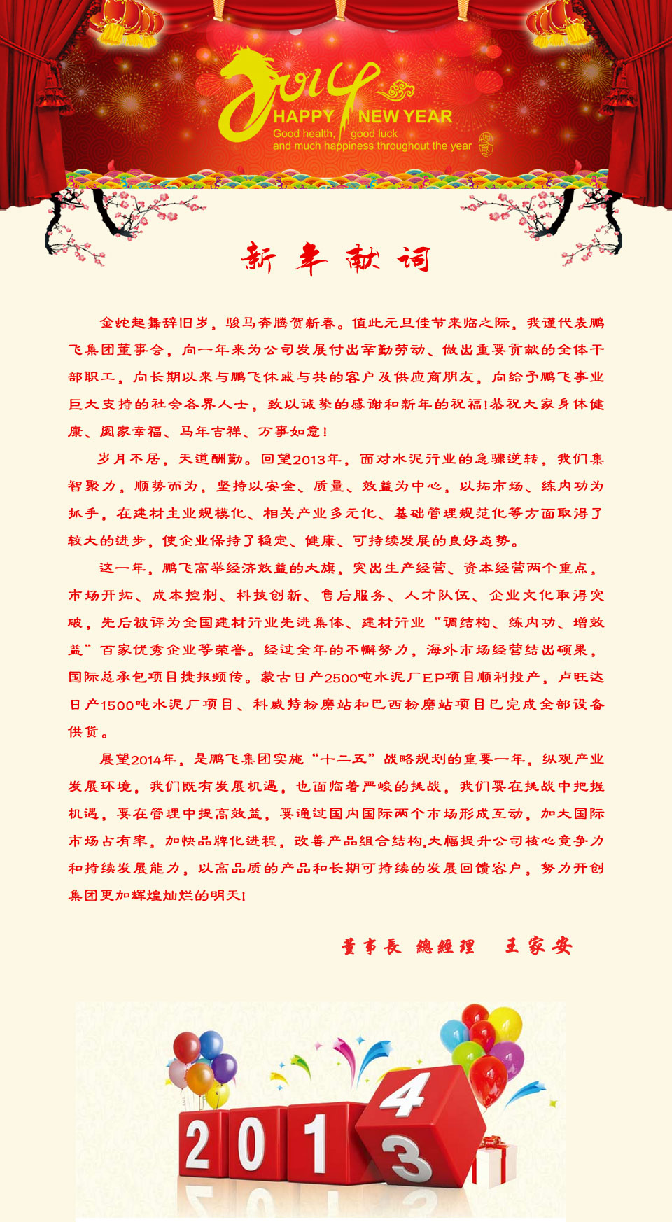 江蘇鵬飛集團股份有限公司董事長、總經理2014新年獻詞