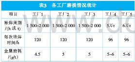 表3為PFMS2800磨耗統(tǒng)計。從表中可以看出,堆焊周期都達到并超過1500h,金屬磨耗為5g/t左右。