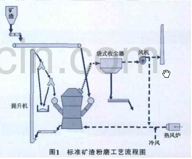 礦渣立磨粉磨系統(tǒng)由以下幾部分組成:粉磨系統(tǒng)、原料中轉及輸送系統(tǒng)、外循環(huán)系統(tǒng)、成品收集系統(tǒng)、供風系統(tǒng)、供熱系統(tǒng)。圖1為標準的礦渣粉磨系統(tǒng)工藝流程圖。
