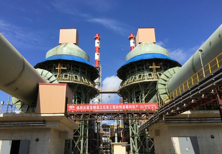 廣東湛江鋼鐵基地石灰工程主要由原料儲(chǔ)運(yùn)系統(tǒng)、焙燒系統(tǒng)、成品儲(chǔ)運(yùn)篩分系統(tǒng)、石灰石破碎系統(tǒng)、輕燒白云石篩分壓球系統(tǒng)、配套公輔系統(tǒng)組成,一步工程設(shè)計(jì)建設(shè)兩座1000TPD回轉(zhuǎn)窯,設(shè)計(jì)產(chǎn)能活性石灰46.53萬噸/年、輕燒白云石17.86萬噸/年。回轉(zhuǎn)窯焙燒采用豎式預(yù)熱器→回轉(zhuǎn)窯→豎式冷卻器工藝布置,通過預(yù)熱器的預(yù)分解、回轉(zhuǎn)窯的高溫煅燒,生產(chǎn)出高品質(zhì)的活性石灰和輕燒白云石,主要為煉鋼系統(tǒng)服務(wù)。其中工程主要設(shè)備——鍛燒回轉(zhuǎn)窯,規(guī)格為